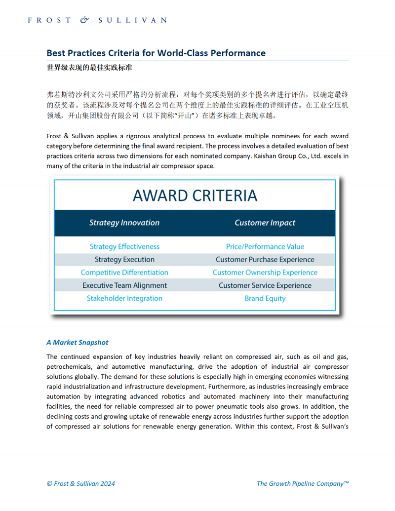 Frost & Sullivan對開山獲得“全球工業(yè)壓縮機(jī)競爭戰(zhàn)略領(lǐng)導(dǎo)獎”的頒獎詞